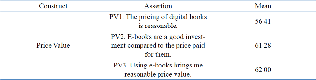 For the variable Price Value (PV), we formulated the assertions PV1, PV2 and PV3, whose response means are presented in Table 7, with a scale ranging from 0 to 100 points.