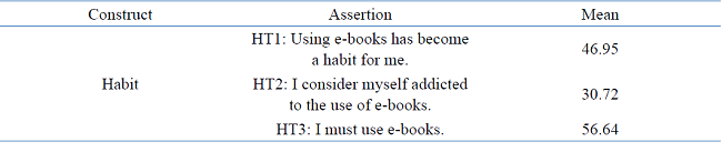 For the variable Habit (HT), we formulated the assertions HT1, HT2 and HT3, whose response means are presented in Table 8, with a scale ranging from 0 to 100 points.