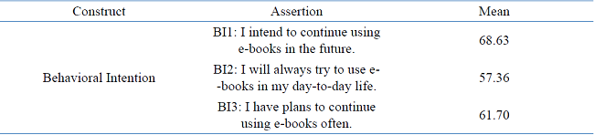For the Behavioral Intention (BI) variable, we formulated assertions BI1, BI2 and BI3, whose response means are presented in Table 9, with a scale ranging from 0 to 100 points.