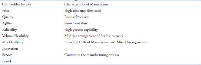 The Competitive Dimensions, also called competitive Factors, should be unfolded in Manufacturing Characteristics, when then the production characteristics are defined to answer the priority competitive factors, thus leveraging competitiveness. Table 1 presents an example of alignment between Competitive Factors and Manufacturing Characteristics.