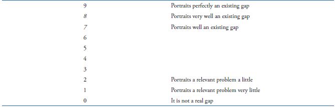 After the definition of the importance rank of the Competitive Dimensions for a certain SBU, the method will lead the user to question themselves about the real demands towards each competitive dimension, following the sequence of the most important to the least important dimension. Each technique battles certain demands/problems. Therefore, when reading the general problem(s) and the specific ones to the competitive dimension mentioned, the user verifies how much they identify their reality in such problems, general and specific, attributing an index, according to table 11. The 9 point Likert scale was used as a reference, besides the zero index, which determines that a certain gap does not exist.
