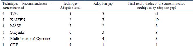 In the example of table 13, although the Kaizen technique had been the second recommended technique (TPM was the first recommended technique) by the original method, due to the fact that its adoption gap is higher than the TPM technique, the Kaizen technique became the first recommended technique;