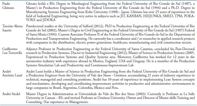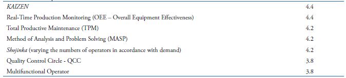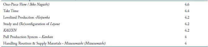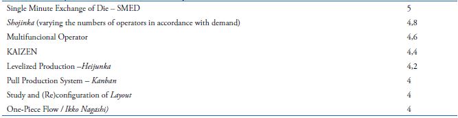 The main author/scholars of production practices and techniques researched were: 1) Antunes Júnior, Klippel, Seidel and Klippel (2013); 2) Antunes Júnior and Produttare Consulting (2008, 2015); 3) Pacheco (2012), whose study researched authors as Inman, Sale and Green Jr. (2008), Pettersen (2009) and Mehrjerdi (2011); 4) Machado and Heineck (2001); Martins (2009); 5) Veiga, Lima and Costa (2008); 7) Ghinato and Lean Way Consulting (1996, 2000, 2015).