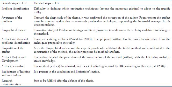 The research method chosen was the Design Science Research. Since the goal of the present study is to define a method of strategic production management, identifying and synchronizing the best existing methods design research is regarded as the most appropriate method.
