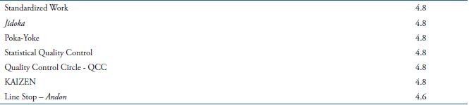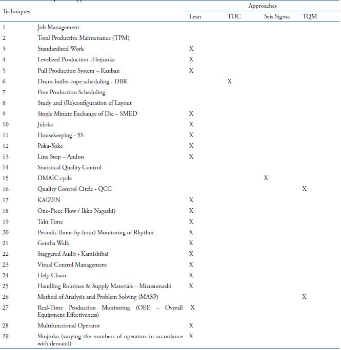 The majority of the 25 production techniques and practices of the method's final list belong to a specific approach/theory/system: the Toyota Product System (TPS) Theory of Constraints (TOC), Six Sigma and Total Quality Management (TQM). Table 3 correlates the techniques with their respective approaches.