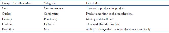 Paiva et al. (2009) claims that there are five competitive dimensions in the production area that relates to the business strategy:
