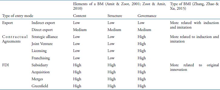 Johansson and Abrahamsson (2014) investigated how business models were used and innovated by three born global companies of service to catch new business opportunities. They identified that sensing capabilities, entrepreneurship, and relational capabilities represent the core to manage and to innovate a BM. The companies used the BM concept as a tool to 'navigate' their value chains to achieve international success. Casadesus-Masanell and Ricart (2010) analyzed innovative companies in Catalonia to understand the need for adapting BM to changes in the environment so they could keep their competitiveness. The researchers considered the companies' paths to innovation and internationalization. Each of the investigated companies had followed a different route to it, but they all needed to adapt their BM to remain competitive. The three mains 'lessons' learnt from these companies are: to be alert and take advantage of changes in the environment, to search for robust virtuous cycles and support them with complementary choices, and to focus on virtuous cycles that generate added value. As presented, the linkage of the internationalization through different types of entry modes and the need for BMI is a new study field. To start establishing the connection between the subjects, the next section presents the entry modes and a critical literature review with an analysis considering the literature previously presented in this article, in special the studies by Amit and Zoot (2001), Zoot and Amit (2010) and Zhang, Zhao and Xu (2015), as we use them as the base for the theoretical model.