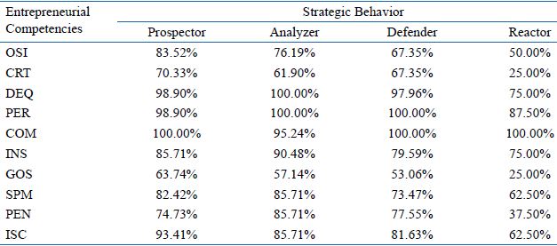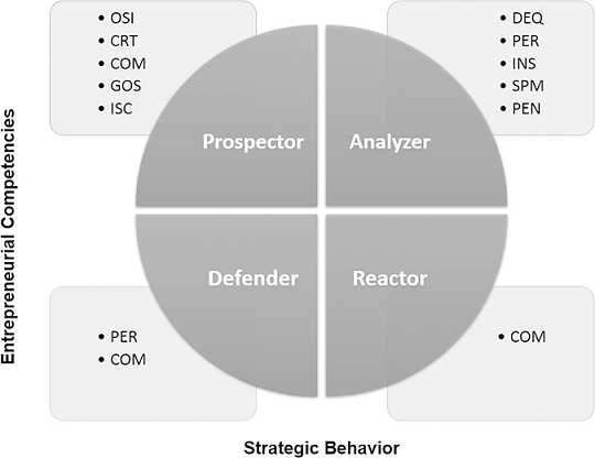 The findings also allow concluding that certain entrepreneurial competencies are more frequently found linked with certain strategic behavior types. The competencies OSI, CRT, COM, GOS, and ISC are more frequently possessed by Prospectors. The competencies DEQ, PER, INS, SPM, and PEN are more strongly associated with Analyzers, the competencies PER and COM are also observed in Defenders, and Reactors are most likely to possess COM. The information in Table 5 demonstrates the percentage of individuals with each of the ten entrepreneurial competencies present for the four groups of strategic behavior, revealing the competencies most closely associated with each of the Miles and Snow (1978) standards.