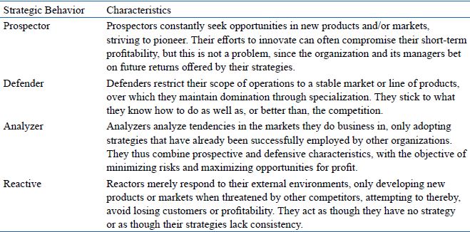 Considering this assumption, Miles and Snow (1978) developed a typology to facilitate understanding of organizations' adaptation processes, reducing organizational behavior patterns to four types: the Prospector, the Analyzer, the Defender, and the Reactor. These patterns of strategic behavior spring from the differences in how organizations respond to three problems: the entrepreneurial problem, or the problem of defining the product and target market that the firm will serve; the engineering problem, or development of a system capable to operationally solve the answer to the entrepreneurial problem, and the administrative problem, which is related to organizational structure. Together these three problems comprise what the authors termed as the Adaptive Cycle. According to Miles and Snow (1978), each of the behavior types has a characteristic response to the cycle, as described in Table 1.