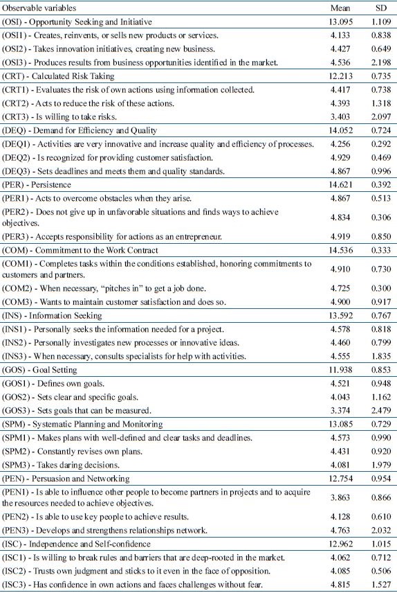 The highest mean scores for observable variables were as follows: (DEQ2), “Is recognized for providing customer satisfaction” at 4.929; (PER3) “Accepts responsibility for actions as an entrepreneur” with 4.919; and (COM1) “Completes tasks within the conditions established, honoring commitments to customers and partners”, with a mean score of 4.910.