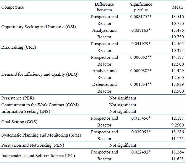 Entrepreneurs with Prospector behavior exhibited significantly higher means for four of the six competencies (OSI, CRT, GOS, ISC). Entrepreneurs who were classed as Analyzers had higher means for two other competencies (DEQ and SPM). In the four competencies for which Prospectors had the highest means, Analyzers had the second highest values. Defenders had the third highest means for all of these competencies. In turn, Reactive Entrepreneurs had the lowest means for all six competencies with significant differences. This result is relevant with respect to both of the theories on which this study is founded.