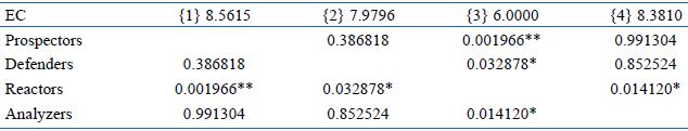 The results demonstrate that there is indeed such a relationship in the sample studied, since analysis of the differences between mean scores for each competence against strategic behavior types led to the conclusion that six of the ten competencies were statistically different between different types. The great majority of these differences were observed between Prospector and Reactor behavior types. Of the six competencies with significantly different means, entrepreneurs Prospectors have higher values of four (OSI, CRT, GOS and ISC) and Analyzers for the other two (DEW and SPM). In cases where Prospectors means were higher, Analyzers had the second highest means, followed by Defenders. This fact can be explained by statements made by Gimenez et al. (1999) and Desarbo et al. (2005), who state that the behavior of Analyzers is a compromise between the characteristics of Prospectors and Defenders.