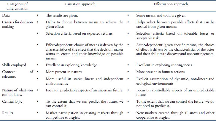 The process of creating and developing a company has two main approaches: (a) the classical, based on causality and linearity, called Causation; and, (b) the emerging, contingency-based one, called Effectuation (SARASVATHY, 2001; 2009). Thus, the Causation approach is based on decision analysis and planning, while the Effectuation approach operates in a non-predictive logic, in which emerging strategies are applied to opportunities that arise during the entrepreneurial process (CHANDLER et al., 2011; FAIA; ROSA; MACHADO, 2014).