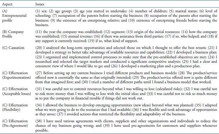 As for the instrument of data collection, we used a questionnaire with 39 closed and semi-structured questions. In the first section (Part A), the personal profile of the entrepreneur was raised. The second section (Part B) consisted of questions about the company profile. The last section (Part C) of the instrument presents the variables related to the Causation and Effectuation approaches, based on the scale developed by Chandler et al. (2011) and already used in Brazil by Faia, Rosa and Machado (2014), in which a 7-point Likert scale was used, varying from “totally disagree” to “totally agree”. All aspects and issues addressed in the collection instrument were set out in Table 2.