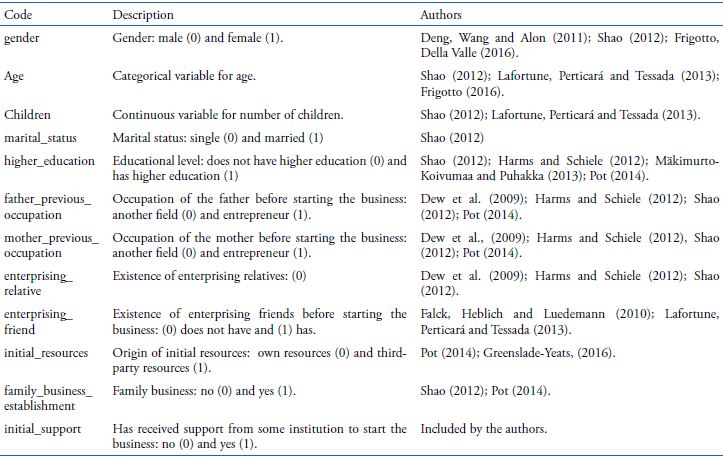 In relation to the family background, its inclusion is justified by the possibility of intergenerational transmission of the entrepreneurial behavior (COLOMBIER; MASCLET, 2008; CHLOSTA et al., 2012; HOFFMANN; JUNGE; MALCHOW-MØLLER, 2015; LINDQUIST; SOL; VAN PRAAG, 2012; WYRWICH, 2015). The literature points out that growing up in a family where parents are entrepreneurs represents a particular context in which decisions are made (ALDRICH; CLIFF, 2003; CHLOSTA et al., 2012). Entrepreneurial parents provide an information-sharing environment such as a demystified view of entrepreneurial activity, access to resource sources, and information on business opportunities (SHAO, 2012). Aldrich and Cliff (2003) developed a framework based on the perspective of family integration in the creation of new ventures. They postulate that factors such as resources, changes in family composition and norms, attitudes, and values held by families influence each other and in turn influence the process of entrepreneurship.