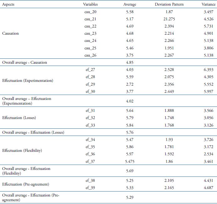 Regarding the average of the factors, the Causation dimension presented an overall average of 4.85 on the Likert scale. The other factors presented averages between 4.02 (Effectuation) and 5.76 (Effectuation - Losses), the latter having the highest average. It should be noted that correlations between variables can be found in appendix 1 of this manuscript. The next section will present the methods used by this study.