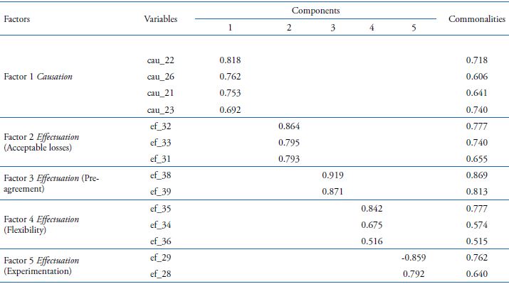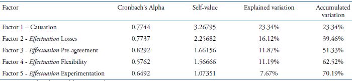 Factor analysis is a technique of variable interdependence, whose main objective is to describe covariance relations between a determined group of variables in order to find directly unobservable factors and to explain their relation with observed data (LATTIN; CARROLL; GREEN, 2011). Each grouping of variables represents a construct separately. In principle, the research instrument for data collection was composed of the dimensions “Causation”, “Effectuation - experimentation”, “Effectuation - losses”, “Effectuation - flexibility” and “Effectuation - pre-agreement”. We used factor analysis in order to validate the consistency of these factors as interdependent (HAIR et al., 2005).