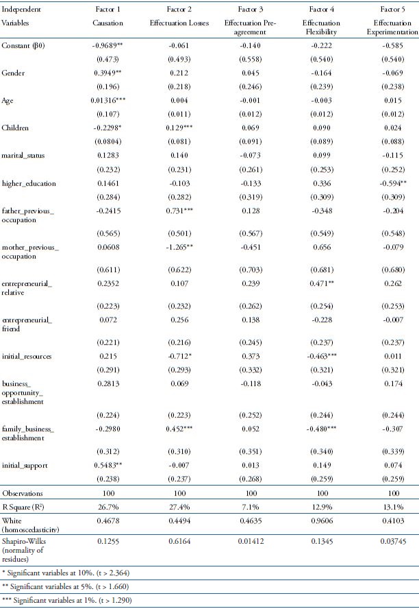 From the validation of the instrument through the factor analysis, 5 dimensions were extracted that were used as dependent variables in the regression models, aiming to associate the entrepreneur’s actions (Causation and Effectuation approaches) and gender, controlling for variables listed in the literature.