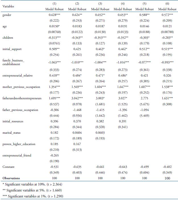 The control variables “age”, “number of children” and “support of some entrepreneurship promotion agency” also obtained statistically significant parameters, being “age” and “support of institutions of foment to the entrepreneurship”, presenting positive effects, and “number of children”, negative effect.