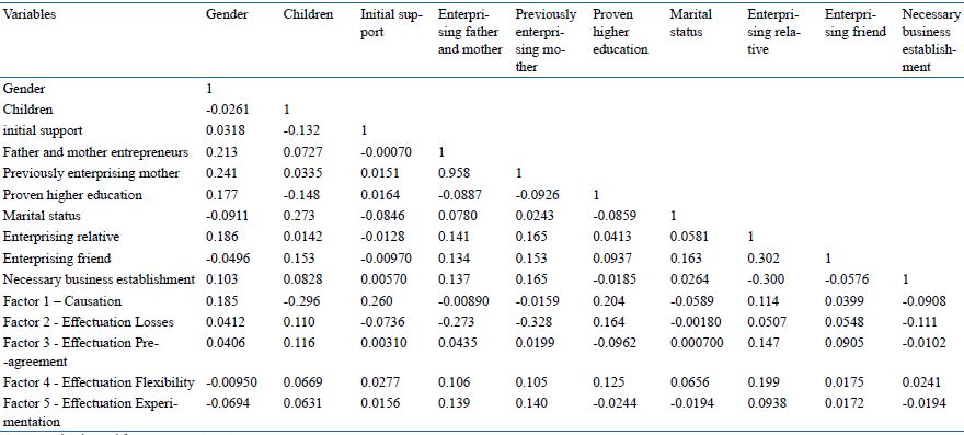 Table 6 presents the results of the rotational factor loadings and respective commonalities. In the analysis, we only kept factors with commonalities above 0.5 - as recommended by Hair et al. (2005) in applied social research. Only six of the 20 variables proposed by Sarasvathy (2001) were not consistent. The variables of questions 20, 24 and 25 (Factor 1 - Causation), 27 and 30 (Factor 5 - Effectuation Experimentation), and 37 (Factor 4 - Effectiveness Flexibility) were not used.