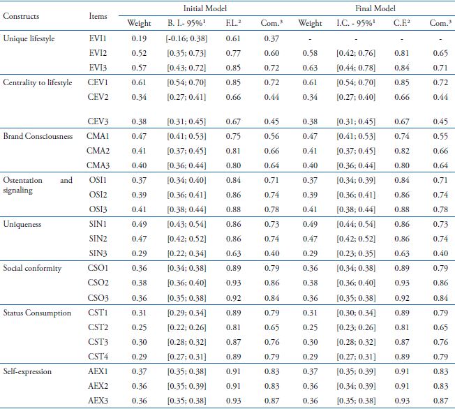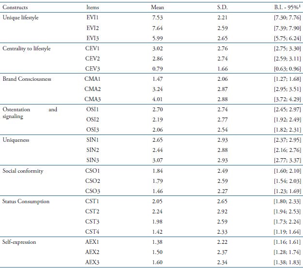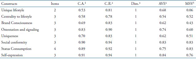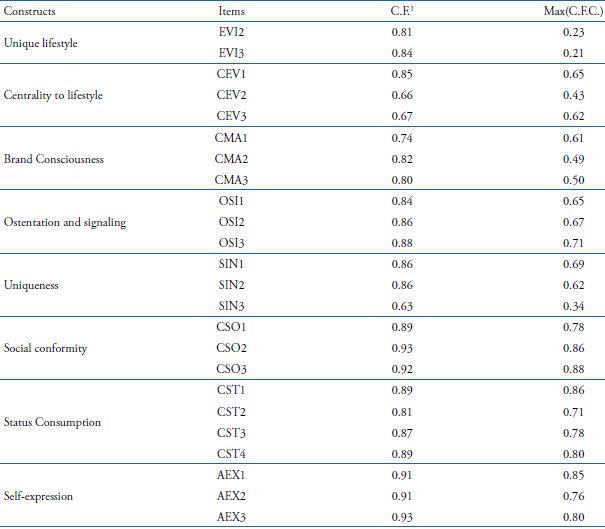 From Table 3, four considerations can be made. Firstly, the Individual Lifestyle, Centrality of Lifestyle, and Brand Consciousness constructs did not show CA reliability indexes above 0.70, but all other constructs had CR reliability indexes above 0.70, indicating their reliability. Second, we can say that all the constructs were one-dimensional. Thirdly, all the constructs had a CVE greater than 0.50, evidencing the convergent validation. Finally, it should be pointed out that, according to the criterion proposed by Fornell and Larcker (1981), there was no discriminant validation for the constructs analyzed, since there were shared variances greater than the respective MEVs. However, using the cross-factor loading method (Barclay et al., 1995) the discriminant validation criterion was reached, since the factorial loads of the items were higher than all the respective cross-factor loadings, as can be observed in Table 4.
