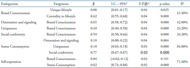 For the Self-expression construct, two points were noticed. Initially, we observed the absence of significant influence (p-value = 0.191, β = 0.04 [-0.02, 0.12]) of Brand Consciousness on Self-Expression. The second one points out that, unlike the first one, there was a significant (p-value = 0.000) and positive influence (β = 0.82 [0.74, 0.88]) of the Status Consumption on Self Expression, which leads to the conclusion that the higher the Status Consumption, the greater the Self-expression.