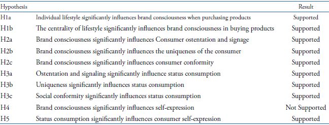 From these results, it is possible to rescue the hypotheses proposed for the research. According to Table 6, we can see that of the ten hypotheses established, only one of them (H4) was not supported by empirical research. This result is not consistent with the studies by Escalas and Bettman (2005) and Grohmann (2009), which sustain the idea that consumers construct their identity through the use of brands. However, the non-confirmation of the hypothesis ends up reinforcing the central proposal of the article when it reveals that the consumption of status influences more directly the self-expression than the brand consciousness, that is, it makes sense to think that the intention of the consumer to buy and display the branded products is to transmit information about themselves to others.