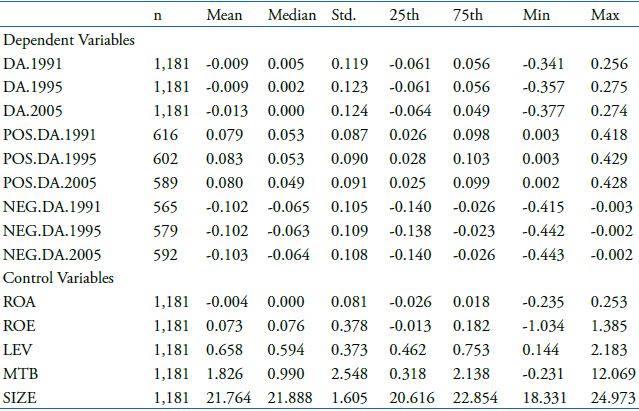 Panel A in Table 2 illustrates the sample’s descriptive statistics (see Appendix A for the variables’ definition). The DA had negative average values for all specifications, suggesting that companies are more conservative when performing discretionary EM. This corroborates the assumption in the entire sample of other statistics. The frequency of positive DA is greater than its negative occurrence of pairs to the accrual model as captured by Jones (1991), and this is the re-estimation suggested by Dechow et al. (1995). However, the negative accumulations values are on average larger than the positive. The negative DA exhibits higher concentration values in the lowest quartile compared to the upper quartile’s positive DA values. Thus, the positive DA are less than the negative DA even with a higher prevalence, causing the average of discretionary accruals to be negative regardless of management’s direction; this indicates that managers exhibit more conservative EM practices in the analyzed companies.