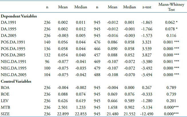 In average the positive accumulations (POS.DA) and negative accumulations (NEG.DA) are larger in non CSR firms (Mann-Whitney Test, p < 0.01). This indicates that EM, regardless of direction, may be greater in firms non-CSR.