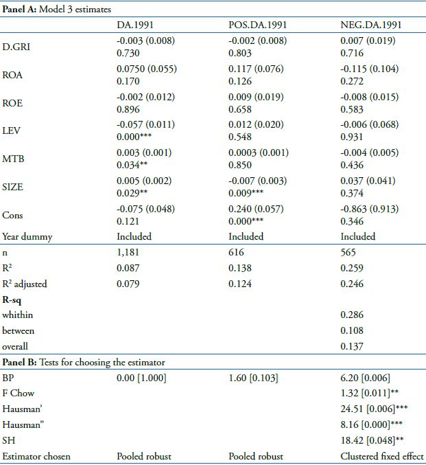 The re-estimates’ of Model 3 didn’t alter the interpretations of the results. The main interest variable (D.GRI) didn’t present statistical significance, preventing the acceptance to the hypotheses raised. As discussed in the section 4.2., there appears to be a signal that EM is influenced by firm-level financial and institutional variables.