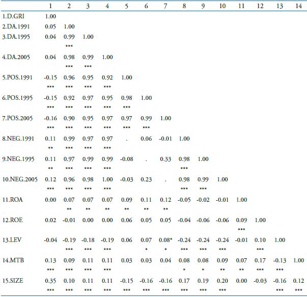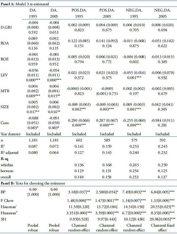 Initially, following Prior et al. (2008) and Pyo and Lee (2013), we estimated the Model 3 with measures of discretionary accruals (DA) as surrogates for earnings management. Previously, because EM may involve either income-increasing or income-decreasing accruals (Klein, 2002; Warfield, Wild, & Wild, 1995), we re-estimated the Model 3 with the DA’s positive (POS.DA) and negative (NEG.DA), as dependents variables. This procedure aims to capture the effect of CSR toward the DA. According Kim et al. (2012), a negative sign between D.GRI and POS.DA will indicate that CSR firms engage less in income-increasing EM; conversely, we interpret a positive relationship between D.GRI and NEG.DA as indicative that CSR firms manage earnings less through accruals.
