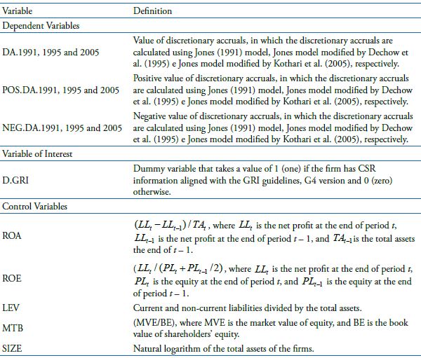 Related studies provide inconsistent evidence that reduces the understanding of this relationship. Chih, Shen, and Kang (2008) report that the relationship between CSR and the adopted FRQ depends on the EM measure. Prior, Surroca, and Tribó (2008) confirmed CSR activities’ positive impact on the management of regulated firms’ gains, but the result does not apply to unregulated companies. Yip et al. (2011), found an anecdotal relationship, according to the sector analyzed, between CSR and EM through discretionary accumulation (DA). Already, recent studies utilizing the scenario that is not mainstream, have demonstrated that the EM, through DA (Laksmi & Kamila, 2018) and manipulations of operating activities (Kolsi & Attayah, 2018) don’t have any effects on CSR disclosures. In this context, this research aims to verify the relationship between CSR and FRQ in companies listed on the Brazilian stock market, based on the dichotomous assumptions identified in the literature.