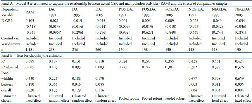 We estimated the model by a cross-section per year, with the DA comprised of the estimates’ residuals. The relationship between CSR and FRQ may depend on the measures adopted (Chih et al., 2008). Thus, we re-estimated Jones (1991) model with the modifications suggested by Dechow et al. (1995), and we remove the portion of the accounts receivables’ range of variation of revenue. We also applied a suggestion from Kothari et al. (2005) and extracted the performance effect in the calculation.