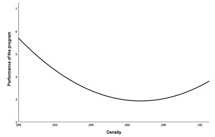 This analysis (graphically presented in Figure 1) shows that density has a negative linear effect on program performance (β = -30.02; t = -4.89; p < .001). However, the quadratic effect on program performance is positive (β = 609.52; t = 2.95; p < .01). These two findings indicate that both linear and quadratic terms of density can explain program performance. Specifically, only the linear term explains 24% of the program performance, while the inclusion of the quadratic term improves the explanation by 9% to 33%. Based on these results, the quadratic effect of density on program performance reveals that a lower or higher density of network can improve program performance, while a moderate density has a detrimental effect. The following equation explains this effect: