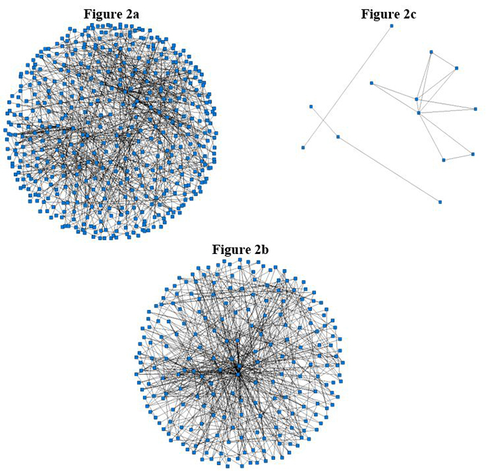 Figure 2 presents three networks to illustrate the effect of density on program performance. Figure 2a shows the network of a program with the highest evaluation score of 7 and the lowest degree of density (.006). Figure 2b depicts a program with a moderate density (based on the mean of the distribution of density of the database) (.024) and an evaluation score of 4 for program performance. Figure 2c illustrates a program with the highest density (.94) and an evaluation score of 3 for program performance.