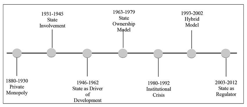 Considering that history can provide an important perspective from which to understand the effect that the institutional environment can have on the economy and on businesses (North, 1990), Figure 1 summarizes the most important changes that have taken place in the electric power industry in Brazil, from its foundation to the 2010s.