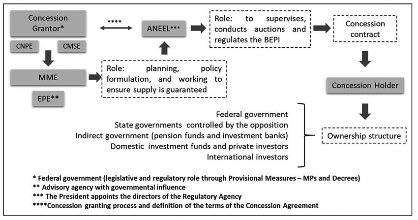 MP 579/12 also provides evidence of the possibility of governmental interference in the various interfaces of the BEPI, given how it has concentrated the roles of concession granting authority, regulator, and shareholder, as illustrated graphically in Figure 2, depicting the theoretical framework. Overall, these results are in agreement with Khanna and Palepu (1997). They argue that, where institutions are weak, there are risks of broken contracts, limitations on transference of profits, government failure to honor guarantees, and regulatory limitations. These combine to create a scenario of marked instability.