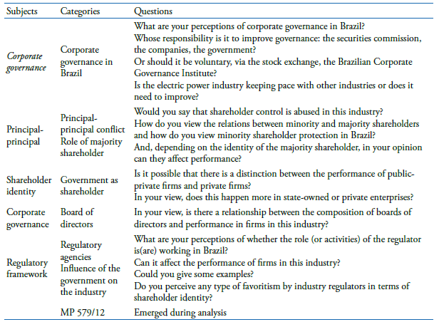Drawing on work by Jensen and Meckling (1976), North (1990), La Porta, Shleifer, and Lopez-de-Silanes (1999), Lazzarini and Mussachio (2010), Young, Peng, Ahlstrom, Bruton and Jiang (2008), and Li and Qian (2013), we conducted a qualitative research project, collecting data by means of interviews conducted with a semi structured script.