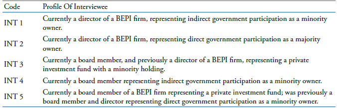 The interviewees were three board members and two directors with a great deal of experience in the BEPI. Three were representatives of a private investment fund, one was an indirect representative of the government via a pension fund, and the last was a direct representative of the government, making a total of five interviewees. The average interview duration was one hour.