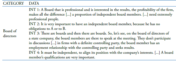 Another finding worthy of note is that the interviewees stated that the number of board members is not as relevant as their qualifications or independence. This is especially important in relation to quantitative studies that use the number of board members as a variable, since, in addition to the size of the board, it is relevant to include variables in the model that control for their level of independence, common in some studies, and also variables related to board members’ qualifications, which represents both a challenge and an opportunity for researchers investigating the subject.