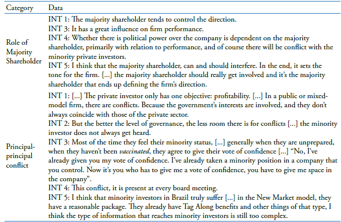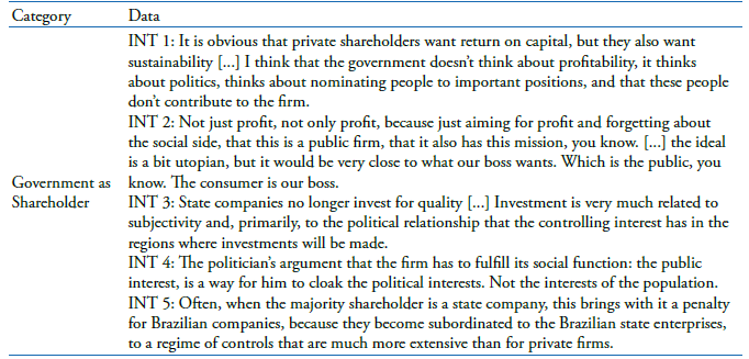 Also of note is the interviewees’ emphasis on the influence that the majority shareholder has on the organization’s performance, which does, in fact, take place. It is also evident that the interviewees consider the minority shareholders’ influence as proportional to their shareholdings. They state that there would be no conflict with the private minority investors if the majority shareholder strove for firm performance. These interviewees, therefore, confirm what Li and Qian (2013) have stated: it is concentration of ownership, in combination with weak institutions (the regulatory framework), that cause conflicts between shareholders when the objectives of the controlling and the minority shareholders do not converge on the maximization of results.