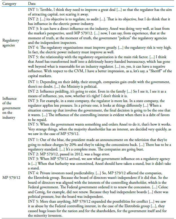 The interviewees’ statements clearly illustrate the government’s influence on the electric power industry as a whole and also on management decisions and the manner of directing business when the government has a controlling holding in public-private ownership companies. These findings are in line with arguments put forward by Lazzarini (2011), which, in turn, have been supported by Brey et al. (2012), for whom the government in Brazil utilizes its own distinctive methods of influencing firms. These methods are directly, through participation in their ownership structures, and, indirectly, through regulation.