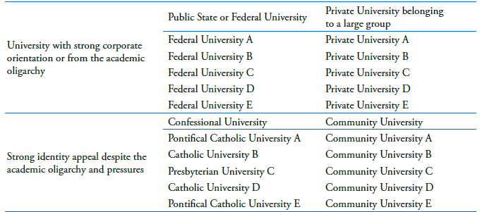 To define the HEI and the IDPs that would constitute the sample, an effort was made to understand how the “universe” of HEIs in Brazil are structured. In this case, the pertinent legislation was consulted, in which HEIs are classified as Universities and Non-Universities. University organizations are divided into universities, specialized universities, and university centers. The group of universities can be further broken down into public (federal, state or municipal), for-profit private universities, or non-profit private universities (community, confessional or philanthropic) (Mondine & Domingues, 2005).