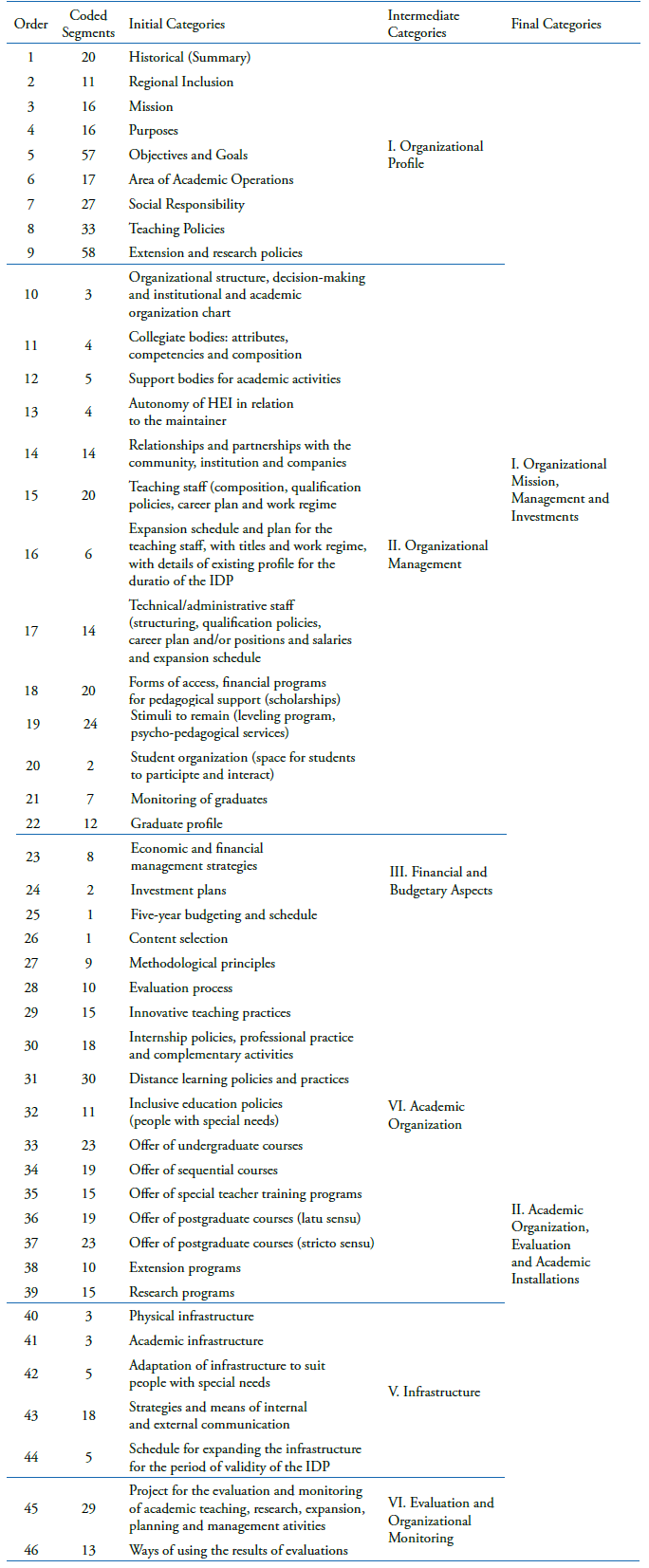 In Phase 2, a total of 695 coded segments were identified based on the reading of 20 IDPs (2,668 pages). This coding was done by clustering each of the 695 segments under a primary code that generically reflected the segmented content. In this phase, 44 primary codes were identified. Later, one by one, the codes were linked according to their characteristics, and another six intermediary codes were identified: organizational profile, organizational management, financial and budgetary aspects, academic organization, infrastructure, evaluation and organizational monitoring. These six intermediary codes were linked to another two final categories (Chart 2).