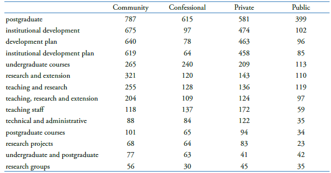 Figure 3 shows that the term “Institutional Development Plan” is concomitantly highlighted by private and community universities. This emphasis on the term IDP by these two types of university in their documents can be explained to a certain extent first by the change in the legal framework of higher education in Brazil, and second as a result of the first, the strict regulation of the sector by the state. It can also be explained by the strong “political” movement in community universities.