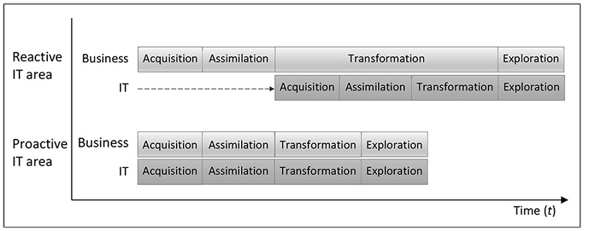 Cases B, C, and D were marked by a reactive posture of the IT area, which positioned itself as a mere internal provider of services to the business areas. In general, the business areas sought new solutions individually for their problems, only calling on support from the IT area after identifying and assimilating the new knowledge, and when its transformation and exploitation involved a computational system: “We try to find [in the external environment], resolve [the problem], write, design what we want, and then the IT area has to execute and implement it” [B-BUS]. In those three insurers, the involvement of the IT area only started during the transformation phase.