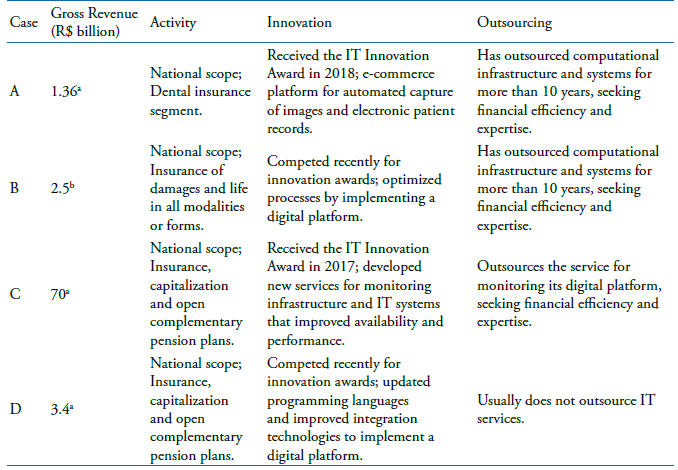 The information about the insurers included in the study is presented in Chart 1. The data on gross revenue was obtained from their annual reports of financial information disclosed publicly. The information on innovation and outsourcing was inferred from the data obtained in the interviews and other documents collected.