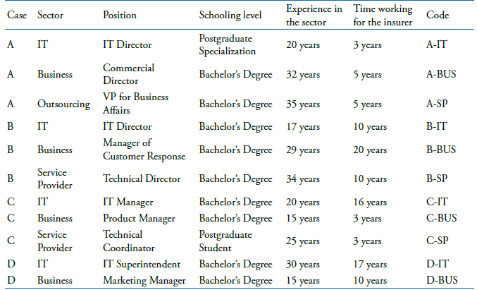 The primary data collection method was semi-structured interviews. The protocol developed included a script with questions formulated based on the constructs extracted from the theoretical framework on AC and its dimensions (acquisition, assimilation, transformation, and exploitation), and the outsourcing of IT services. The questions aimed to discover the degree, conditions, and forms in which IT outsourcing was associated with the AC of each insurer. To attain a broader vision of the themes of interest, for each company we tried to interview a representative manager in the IT area, a manager of one of the main business areas (internal IT client) and a manager of the IT service provider. Since the IT outsourcing practices of Insurer D virtually did not exist, we chose not to interview a representative of outsourced firms.