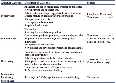The initial phase of the analysis consisted of gathering information on each CSO and seeking, in the collected material, signs of risk taking, proactiveness, and innovativeness and performance in international fundraising. The definitions of the categories used in the analysis are shown in Chart 1. These four categories were treated as codes. However, to remain consistent, in accordance with Stake (1995), who warned that the formal aggregation of categorical data can distract the researcher, most of our time was spent on direct interpretation. The results of the analysis of two cases were discussed with, and validated by, the interviewees.