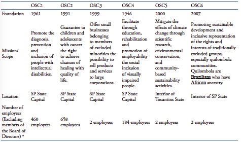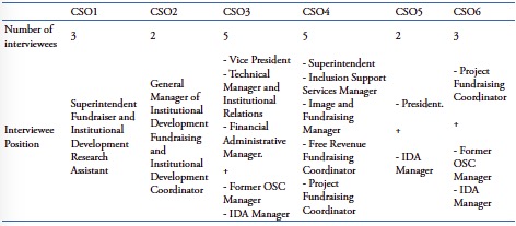 We analyzed Brazilian CSOs with various missions. They had all made efforts to raise international funds, and none of them was linked to any for-profit organizations; nor were they branch offices of CSOs with headquarters in other countries. These criteria were established to avoid the introduction of exogenous factors. IDAs are global institutions, such as the InterAmerican Development Bank (IDB) and the World Bank, with head offices in the United States or European Union. Some of the data pertaining to the CSOs involved in the study are shown in Chart2.